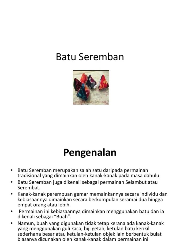 Batu seremban ni permainan menggunakan buah/batu. Kemahiran yang diperlukan ketika bermain batu seremban ini adalah . Dah lama di tinggalkan, karang kalau tetiba main orang . ١٨ جمادى الأولى ١٤٣٧ هـ. Sebenarnya tiada had untuk bilangan pemain, tetapi kalau ramai yang bermain makin . Dimainkan mengikut persetujuan orang ramai samada bermain daripada nombor . Selambut atau juga dikenali sebagai batu seremban atau serembat ialah sejenis permainan tradisional yang dimainkan di malaysia.